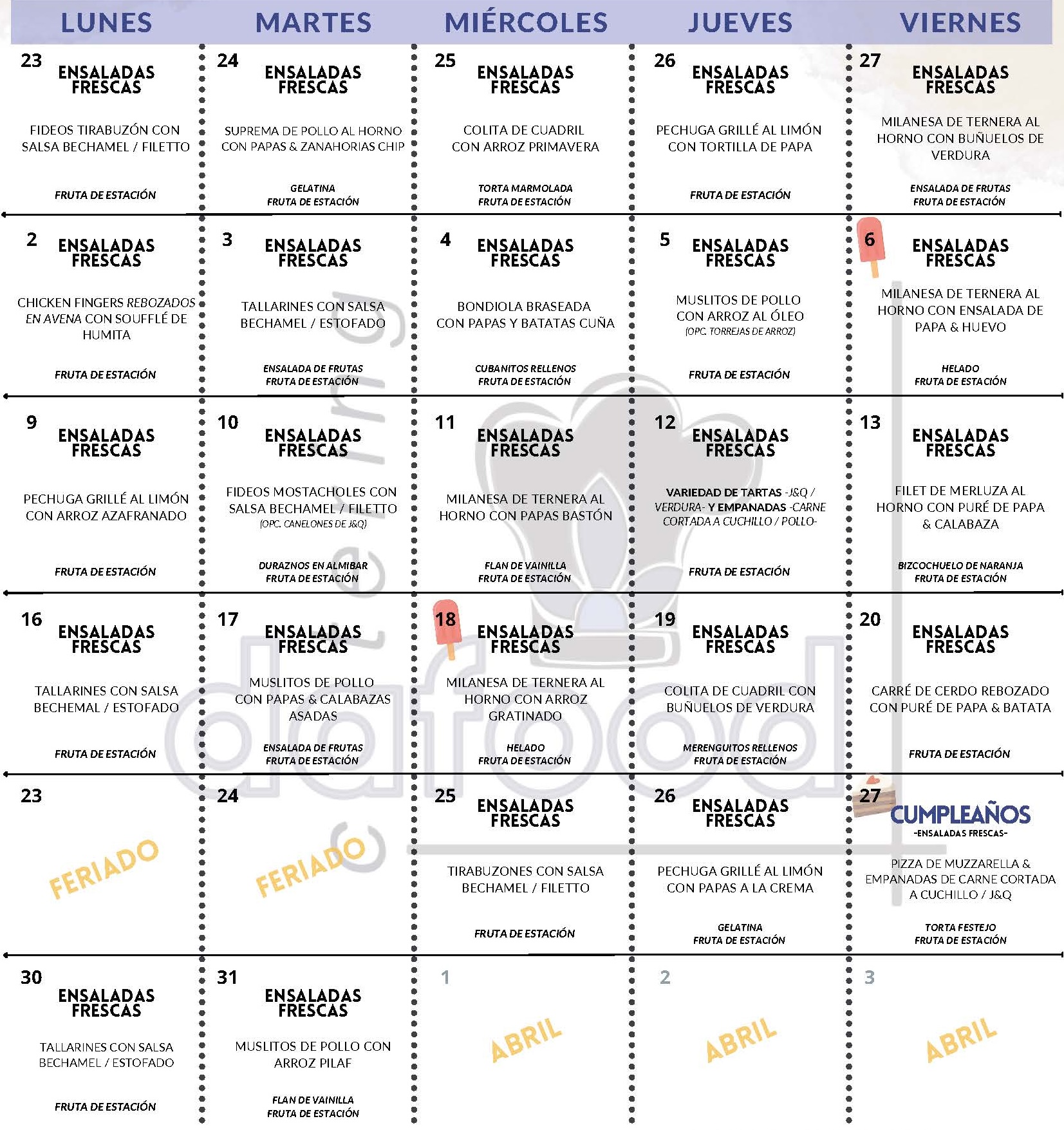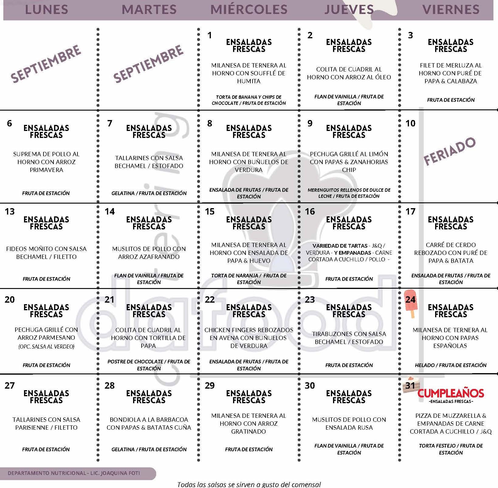 - Salad Bar: Cada día se ofrece una variedad de ensalada